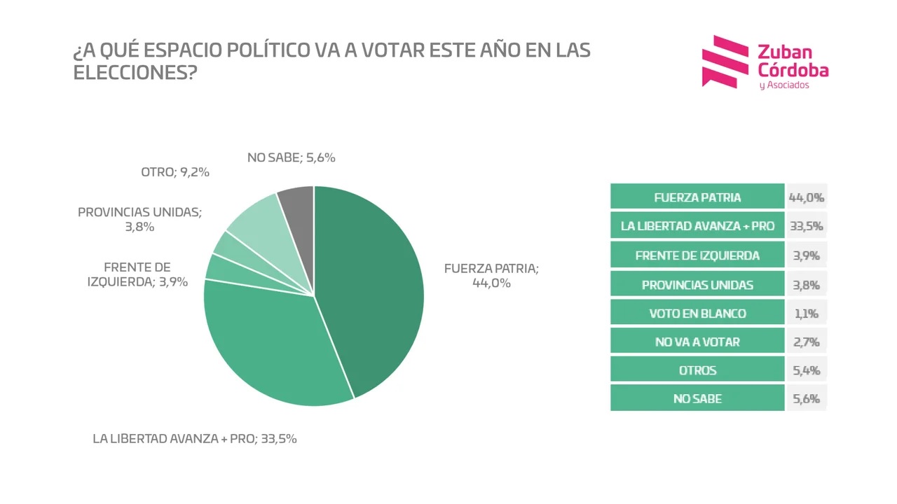 El sondeo realizado entre el 8 y 10 de octubre, muestra un panorama preocupante para las aspiraciones libertarias a dos semanas de las elecciones legislativas. La lista de Fuerza Patria, encabezada por Jorge Taiana, se consolida con un 44% de intención de voto, manteniendo una cómoda ventaja de más de diez puntos sobre la boleta de La Libertad Avanza + PRO, que alcanza el 33,5%.